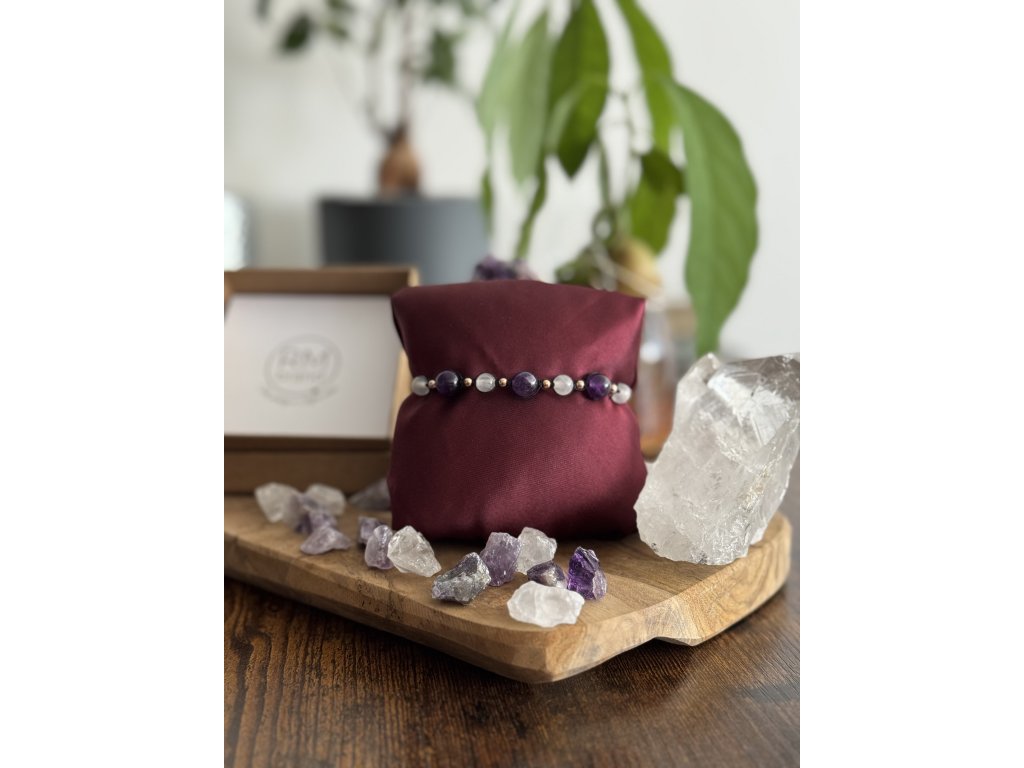 Tento nádherný náramek/talisman je vyroben s krystaly Ametystu a Selenitu, které jsou doplněné o korálky pozlacené 18k růžovým zlatem. Náramek je ručně pletený v duchu Shambally – symbolu vnitřního klidu a propojení s vyšším vědomím.